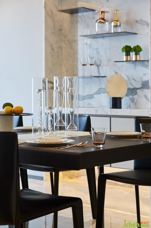 餐廳吊頂延續(xù)客廳手法產(chǎn)生視覺韻律。利用餐桌兩側(cè)立面非承重墻,打造內(nèi)嵌式置物區(qū),以金屬鋼板插入石材的形式錯落分布,同時白色大理石背景與米色硬包、木飾面相輔相成。