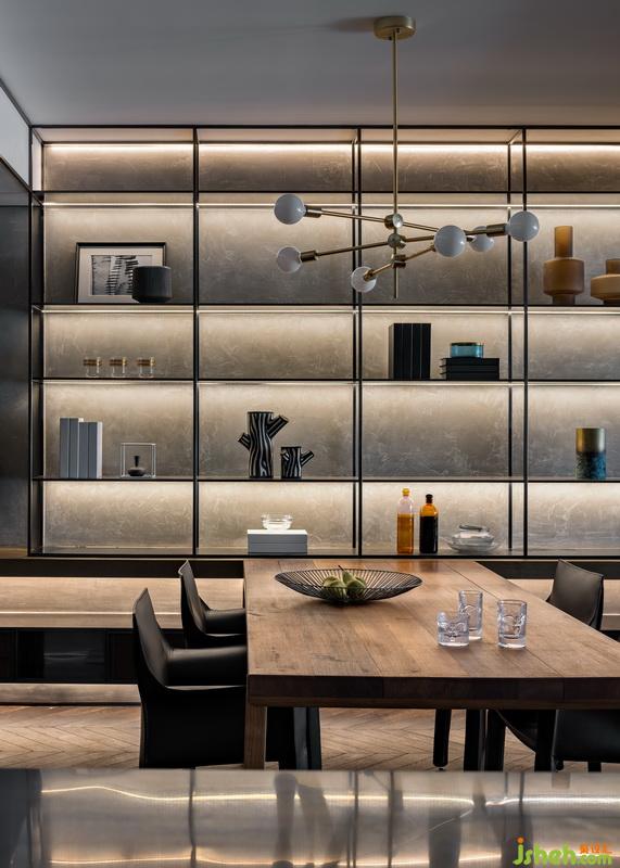 從玄關(guān)進(jìn)入便是開放式格局,客餐廳與廚房一覽無(wú)余。飽含珍重記憶與情意的長(zhǎng)桌是陸導(dǎo)心愛之物,與魚骨拼地板相得益彰,舊物件和諧融入新空間,營(yíng)造出別致韻味。由6mm金屬層板定制而成的格架與燈帶相輔相成,賦予空間獨(dú)特光影魅力。