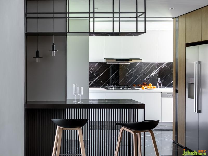 室內(nèi)設(shè)計(jì)師方磊一改原本面積局促的廚房,以黑白為主基調(diào),預(yù)留錯(cuò)落有致的操作臺(tái)面。半敞開式結(jié)構(gòu)與客餐廳產(chǎn)生互動(dòng),亦可靈活使用暗藏玻璃移門,既隔斷油煙,又確保通透。