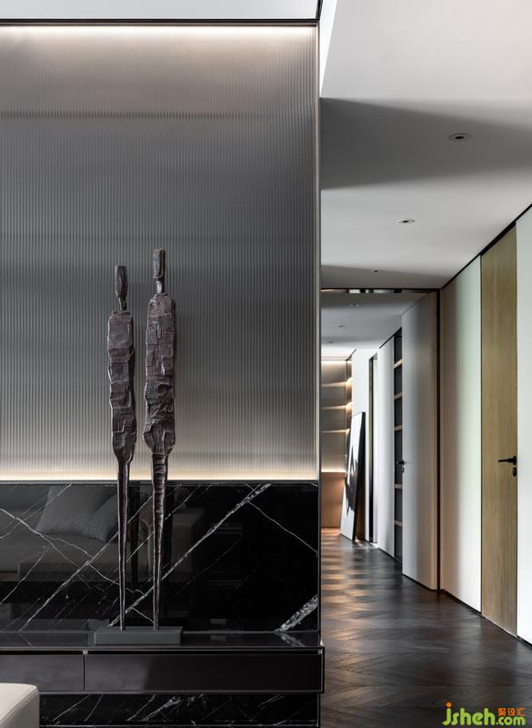 出于陸導(dǎo)職業(yè)習(xí)性考慮,利用刻花玻璃內(nèi)嵌線型燈帶勾勒電視背景墻,猶如舞臺(tái)上的幕布,為業(yè)主營(yíng)造休閑狀態(tài)下關(guān)注娛樂動(dòng)向的儀式感。雕塑與藝術(shù)畫,帶來(lái)精神世界的營(yíng)養(yǎng)供給。