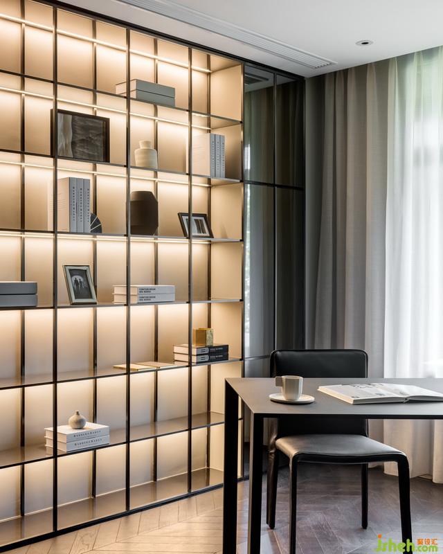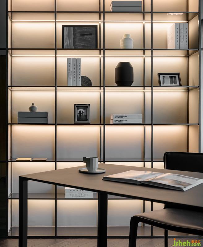 移除書房原結(jié)構(gòu)中非承重墻作為暗門門洞,開放與私密并存。嵌入墻壁定制格架,最大化利用面寬有限的書房空間,輔以內(nèi)置燈帶,氤氳出現(xiàn)代美學(xué)氣息,滿足陸導(dǎo)閱讀或創(chuàng)作訴求。格架對(duì)面非承重墻延續(xù)同樣的改造手法,設(shè)置隱藏式折疊床,可供親友短居,實(shí)現(xiàn)空間靈動(dòng)轉(zhuǎn)換。
