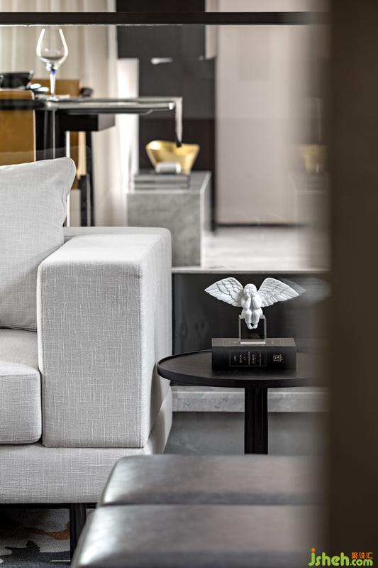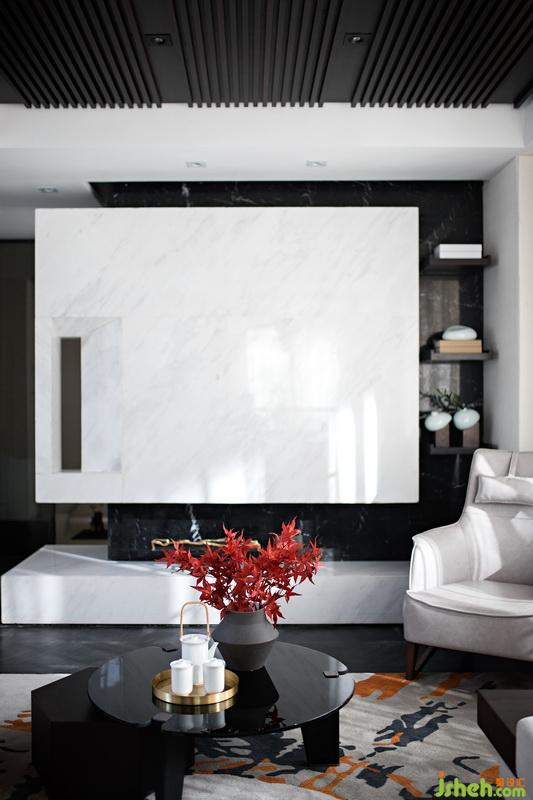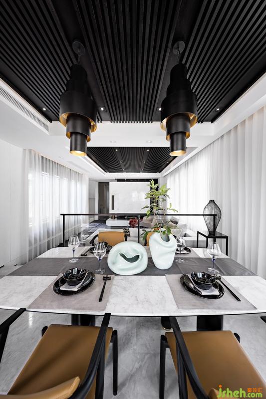黑與白,擺設(shè)與塊面,獨(dú)立又相融,統(tǒng)一于客廳的空間結(jié)構(gòu),散發(fā)出空闊淡泊的風(fēng)度。沙發(fā)線條利落,結(jié)合高低組合形式的茶幾,于簡(jiǎn)約中蘊(yùn)藏豐富的層序美。地毯紋飾、沙發(fā)抱枕以及橙色餐廳座椅形成彼此呼應(yīng),點(diǎn)亮空間,生動(dòng)感躍然而出。飾品擺件恰到好處,插花為空間注入一份明快,寥寥數(shù)筆,人文氣質(zhì)盡顯。