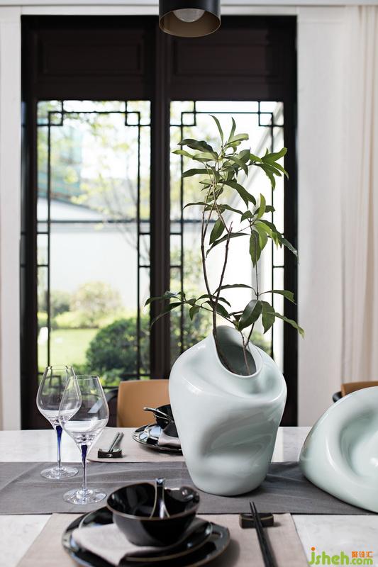 擁有絕佳采光的客餐廳中,一桌、一椅,數(shù)點(diǎn)墨色,均凝聚著空間的形與神,見(jiàn)證著戶外庭院的四季交替。明快的橙色餐椅,喚醒餐廳的活力。青瓷綠植的點(diǎn)綴,營(yíng)造舒適自然的氛圍。精致餐具的有序排列,低調(diào)卻不失內(nèi)涵。