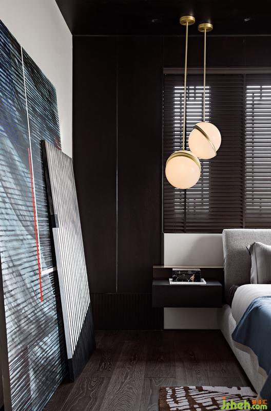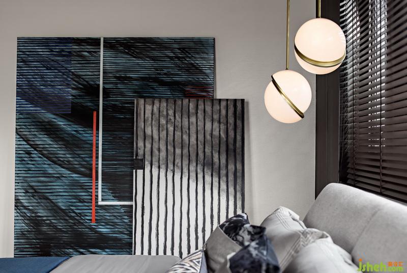 藍(lán)灰色成為主臥的基調(diào),映射出生活的從容與志趣。幾何元素構(gòu)成的抽象畫作,與不同維度的窗戶處以及頂面木百葉、地毯產(chǎn)生對(duì)話,共同演繹線條的極致張力。陽光灑入落下斑駁光影,更是如詩如畫。而一側(cè)高低錯(cuò)落的金屬吊燈一下子就漾開了空間的隨性與暖意。