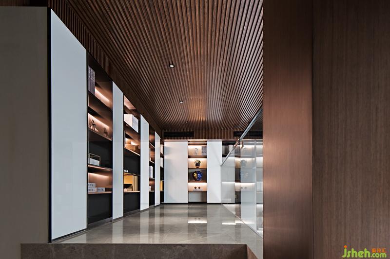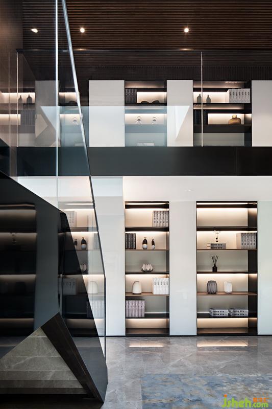 探入夾層,是一處類似圖書館的場景設(shè)計(jì)。每件物品似是穿墻而出,書架層板內(nèi)光影變化和頂部格柵的序列感給人強(qiáng)烈的視覺沖擊。大膽創(chuàng)意的巧思由最下層延續(xù)至此,上下兩部分以黑色塊區(qū)隔,同時(shí)在顏色和塊面形式上承接呼應(yīng)。