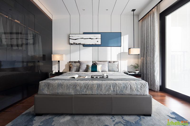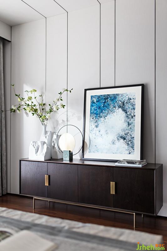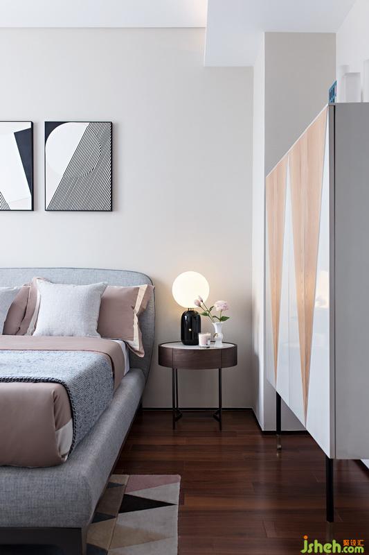 次臥黑白撞色的壁畫,柔和清雅的地毯和儲物柜,怡然自在的體驗(yàn)撲面而來。