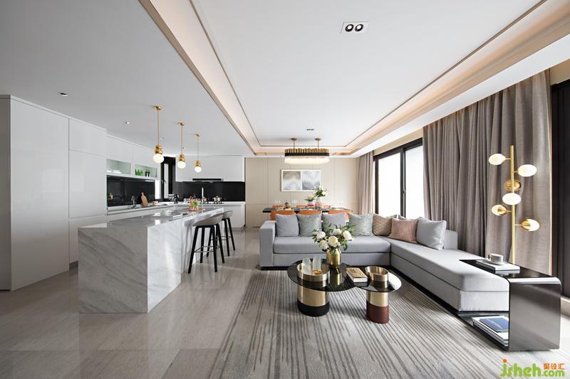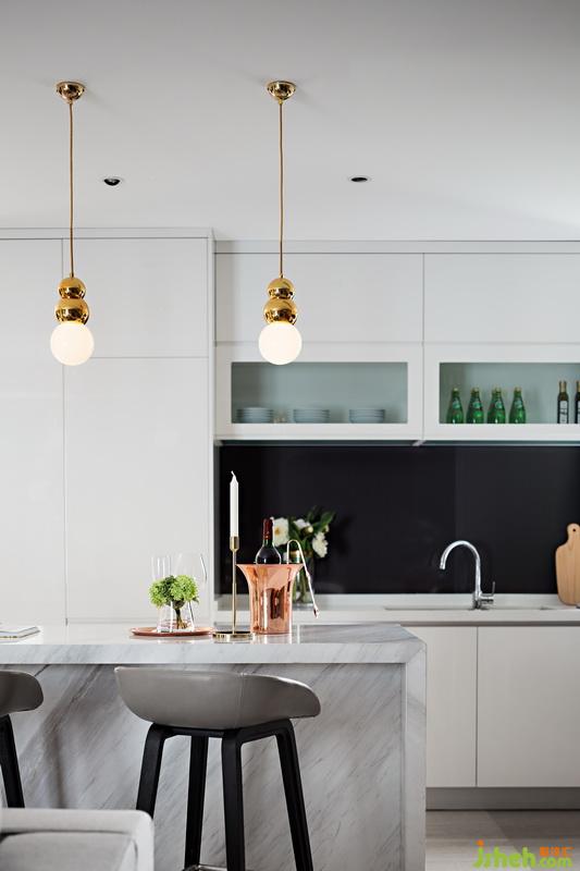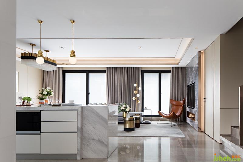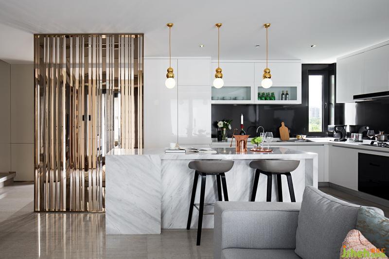 入口玄關(guān)處安放可移動金屬格柵,隔而不斷,又在一定程度上確保私密性。室內(nèi)通過開放交融式設(shè)計(jì),讓廚房、島臺與客餐廳連通,提升空間開闊度,也是對現(xiàn)代生活方式的回歸與重塑。