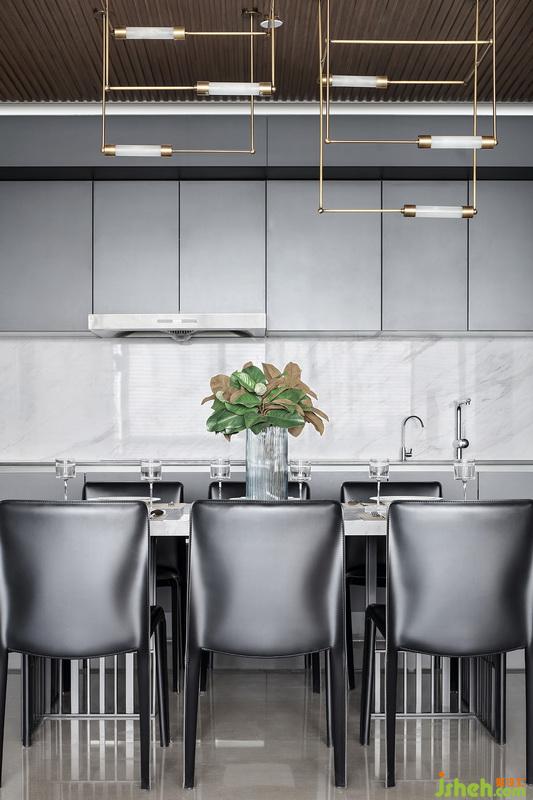 室內(nèi)設(shè)計(jì)師餐廳運(yùn)用錯(cuò)落有致的吊燈,黑白灰元素非規(guī)則堆積的畫(huà)作,軟化空間方正感,勾勒出視覺(jué)宣泄點(diǎn)。