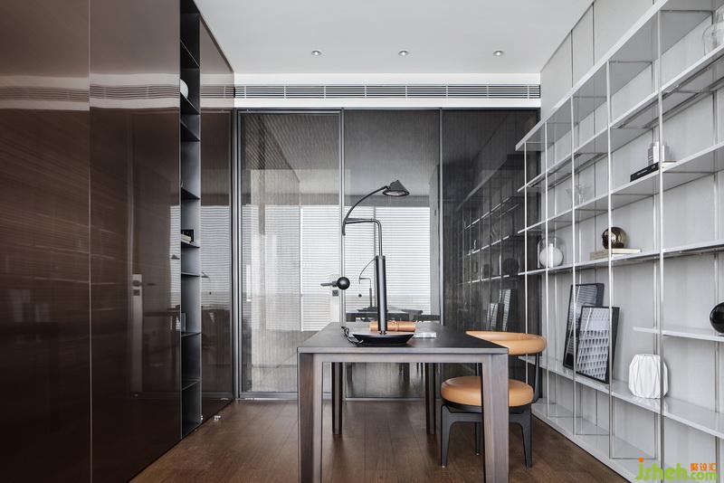 書(shū)房位于電視背景墻后,選用開(kāi)放式書(shū)架,用金屬元素呼應(yīng)整體力量感。落地窗引入光源,基于夾絲玻璃若隱若現(xiàn)的特質(zhì),讓書(shū)房與外部空間關(guān)系上既模糊又交織。