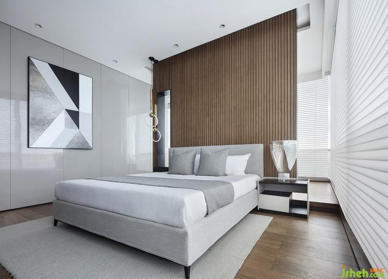 主臥擁有充裕的采光,格柵窗簾與胡桃木元素縱橫間強化虛實韻律。垂落的吊燈,淡然的床品、幾何形塊的畫作,氤氳出融合意境。背景墻以不落地式設計,并引入建筑中套口處理,與后方觀景陽臺展現(xiàn)有趣的空間區(qū)隔。