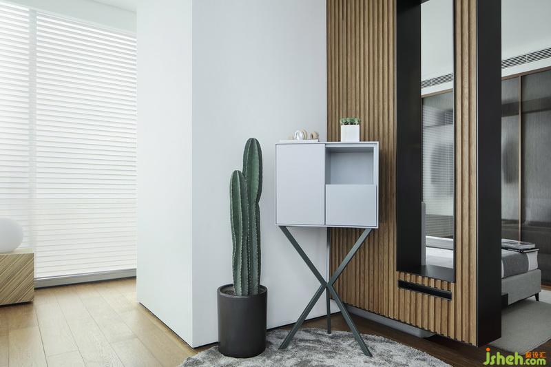 步入式衣帽間與主臥以回形動線相連,增強了空間的流動性。肌理顯著,硬朗之余,木質讓空間變得溫和。此外又與次臥套間的衣帽間在兩端遙相呼應。