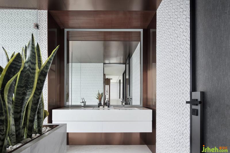 主衛(wèi)將塊面處理手法貫穿其中,定制幾何圖案馬賽克與金屬材質交替混合,燈光暗藏于鏡面四周及頂端,實現(xiàn)設計與功能的統(tǒng)一。