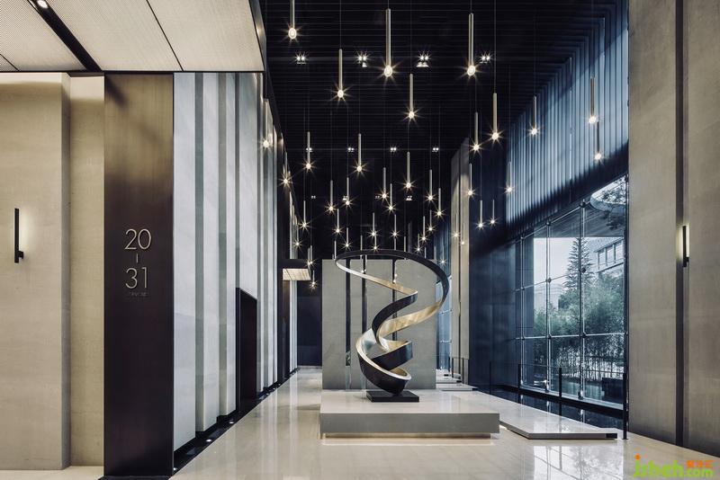花漾錦江C棟入口是整場的氣韻起點,穿插手法打造入戶門,結合一側挑檐與綠植造景區(qū),把這里特有的自然休閑精湛演繹。進入門廳,玻璃幕墻兩側水景設置,形成了室內外空間的對話。依建筑層高優(yōu)勢墜下的燈飾,成為大堂視覺焦點。光影效果配合凹凸線條的層次變化,散射晶瑩剔透。