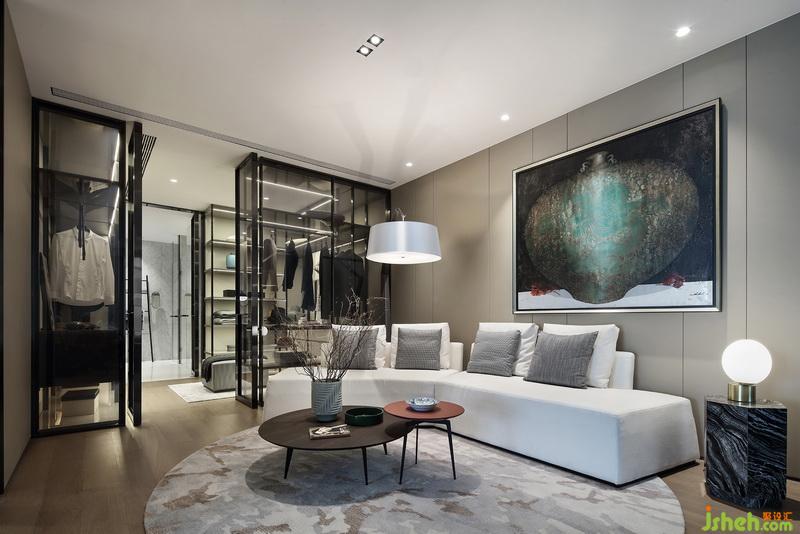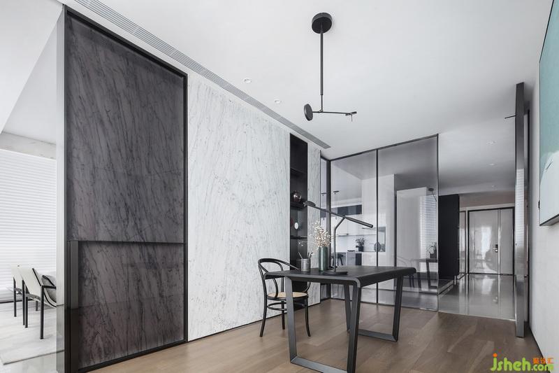 室內(nèi)設(shè)計師將書房與客廳共倚一墻,輔以灰色玻璃又讓空間有互動。在這方正的一席之地,流露著大道至簡的返璞真諦。