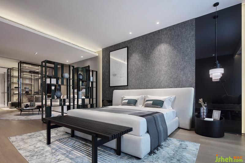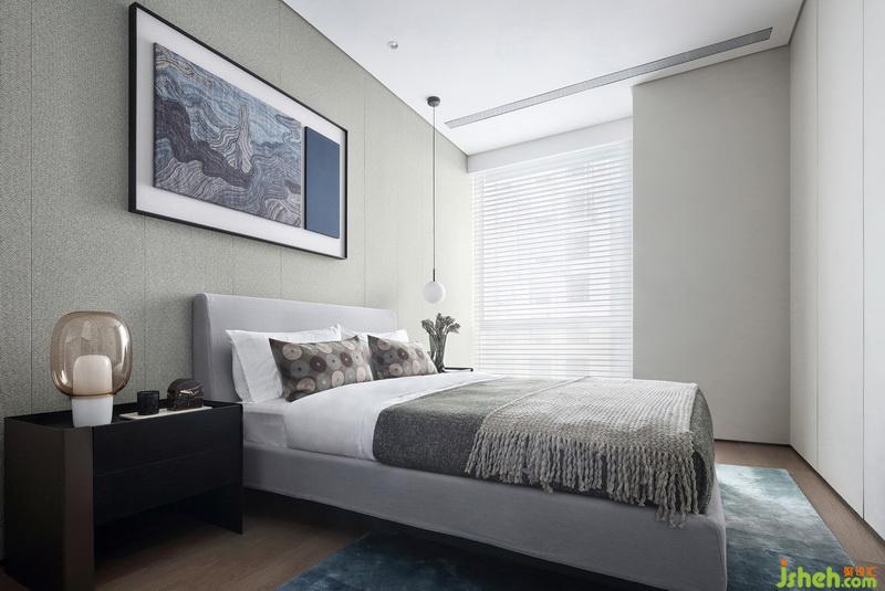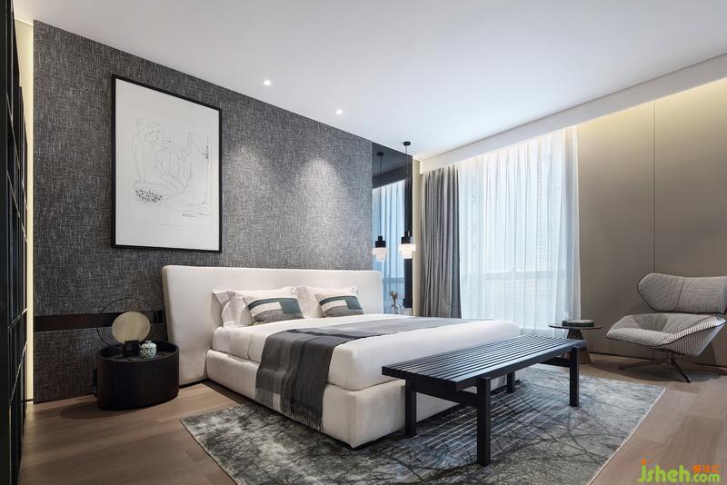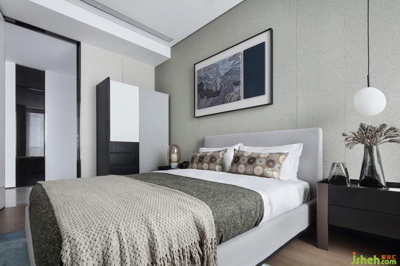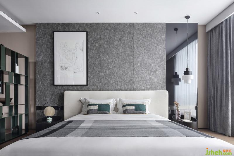 次臥將灰色調(diào)在空間中發(fā)揮到極致,立面上簡潔線條呈序列對望,完成靜謐、平和的情緒表達。
