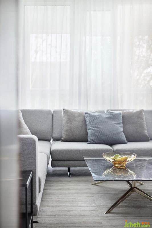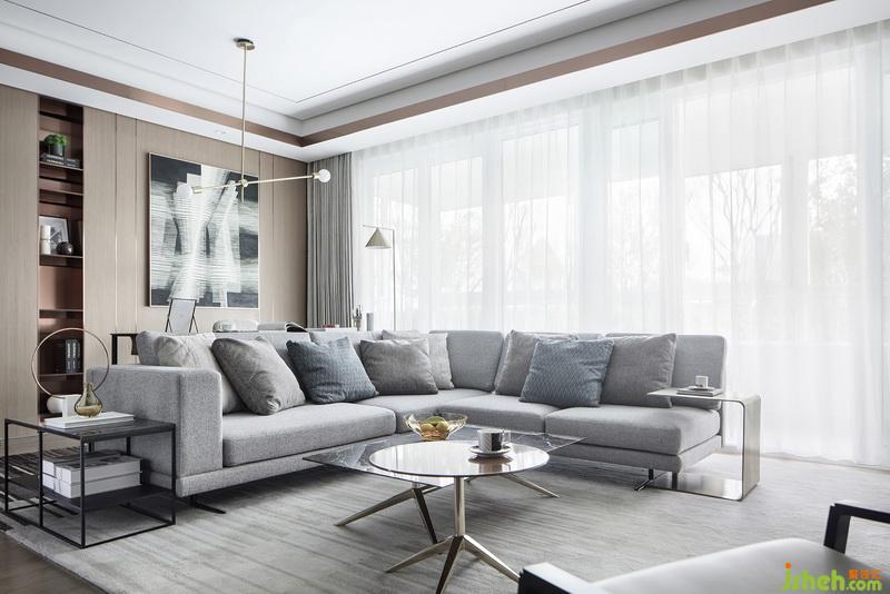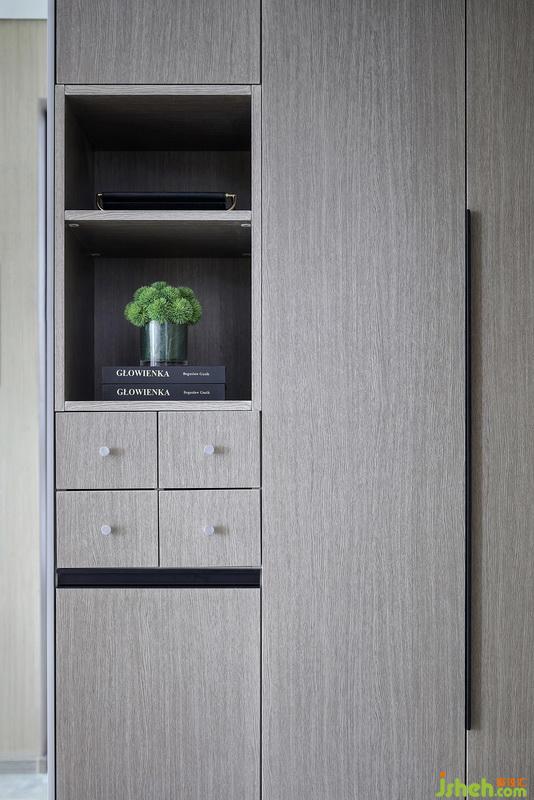 得益于落地窗為室內(nèi)引入明亮光線,映襯出材質(zhì)的自然肌理,鋪陳簡約現(xiàn)代的情景氛圍,為家人互動提供了理想場地。L型沙發(fā)后方設(shè)置書桌,創(chuàng)造客廳穩(wěn)定面,勾勒整體主次關(guān)系??蛷d兩端背景墻,演繹出金屬與石材、木飾面的碰撞,在體塊穿插間傳遞出生活的動態(tài)與平衡的哲學(xué)。室內(nèi)設(shè)計師