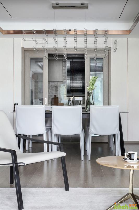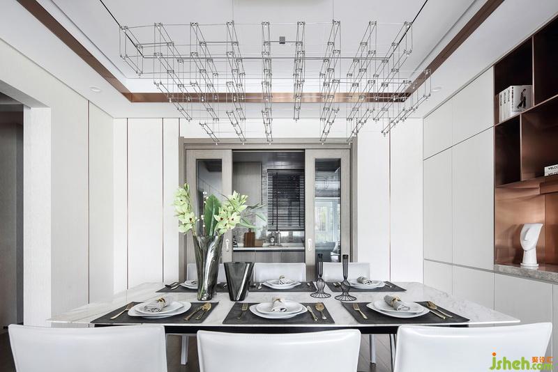 以白色打底襯托出餐廳理性時尚、干凈爽利。零散造型的燈懸于桌面,和金屬線條、方形布局形成一種和諧之美。并且與主色調(diào)相近的餐桌椅,保證與立面視覺協(xié)調(diào)。室內(nèi)設(shè)計師