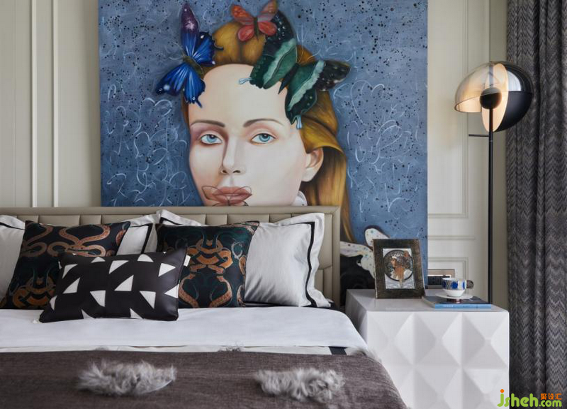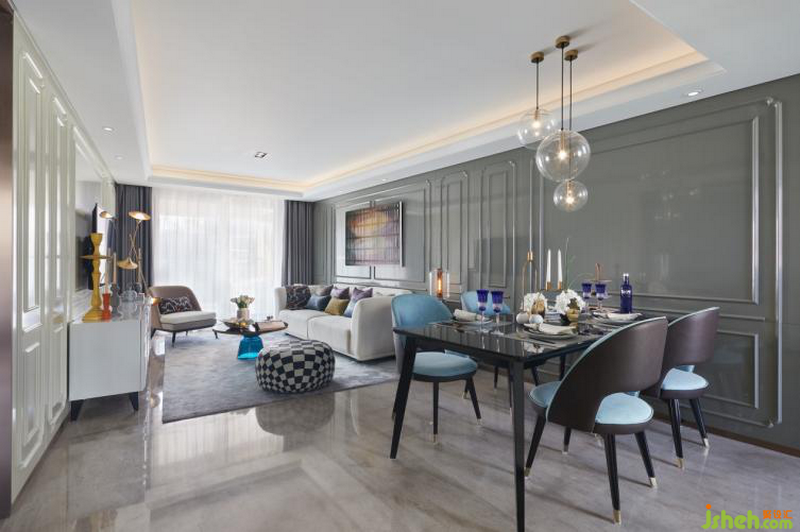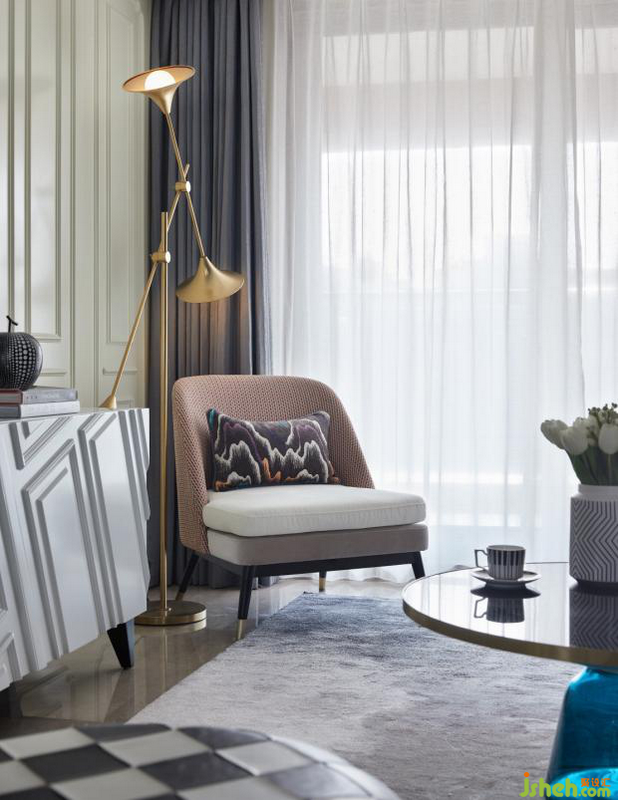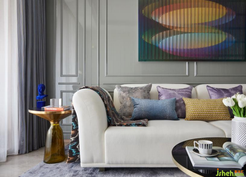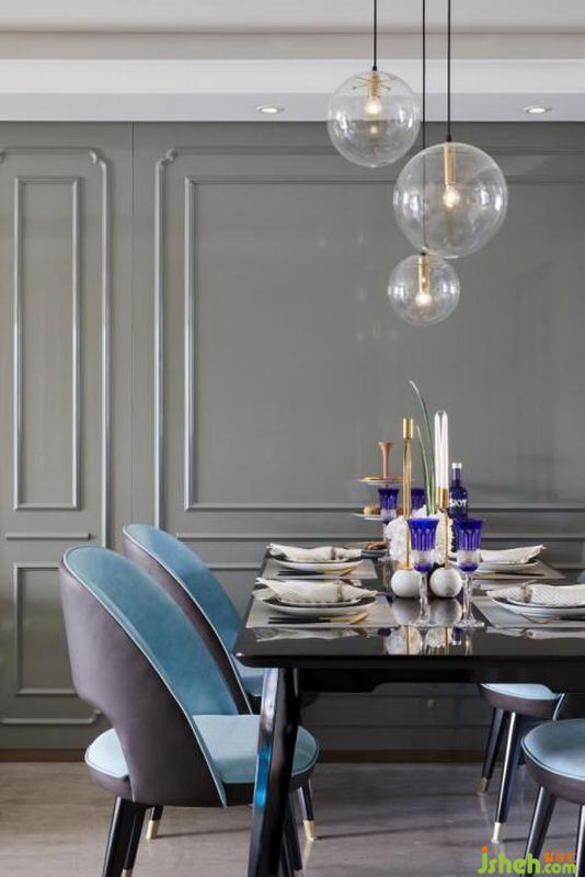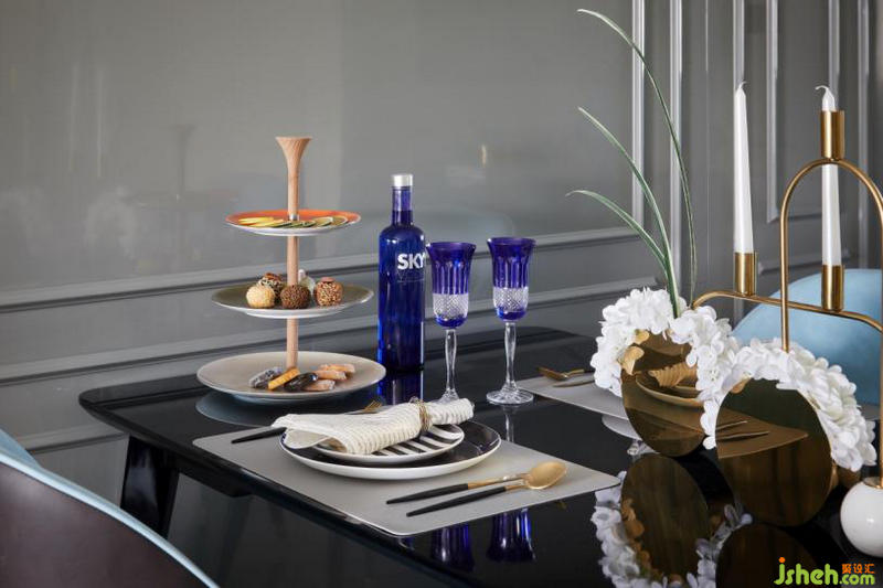 客廳被塑造成一種輕快、活潑的空間感受,落筆之處讓人怦然心動且值得回味。金屬古銅、紫色絨布、真絲漸變地毯,與畫作、餐具,繽紛律動中經(jīng)由深淺藍色系的呼應(yīng)調(diào)和,散發(fā)出一種輕松脫俗的摩登氣質(zhì)。