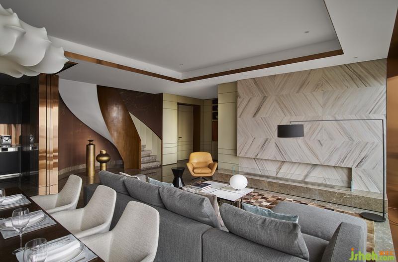 室內(nèi)通過石材、金屬、皮革等材質(zhì)的融合與對比,形成風(fēng)韻現(xiàn)代與優(yōu)雅古典的對話,渲染出國際大都會(huì)的俊朗風(fēng)度??蛷d以對紋理手法打造背景墻,豐富視覺觀感;壁爐升騰,暖意回升。窗外,精致璀璨的都市圖景盡收眼底,坐臥之間,遠(yuǎn)觀近袛,皆融入城市的熱流。
