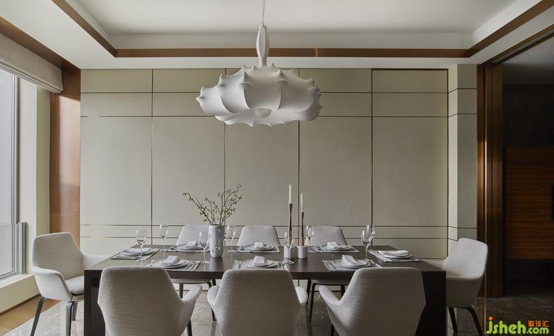 餐廳以高級灰皮革飾面鋪呈,金屬包邊精確分割布局,靜美的白色藝術(shù)吊燈柔和空間硬朗線條,花枝與燭臺裝點(diǎn)成趣,干凈疏朗的氛圍里彌漫著一絲浪漫情調(diào)。