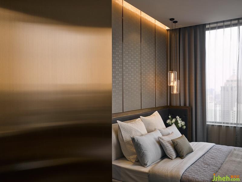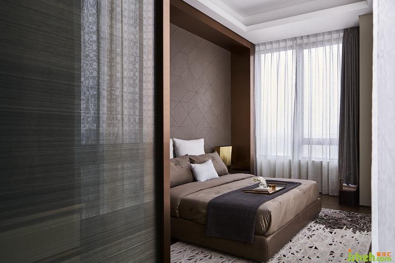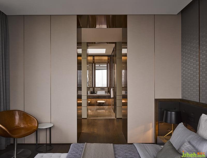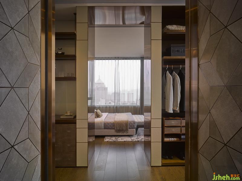 主臥套間內(nèi),十字動線交叉串聯(lián),強調(diào)功能、結(jié)構(gòu)、用材、形式的完整與延續(xù),實現(xiàn)無拘率性、干練利落的質(zhì)感表達。