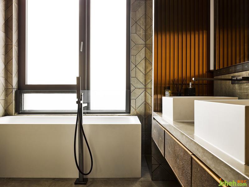 主衛(wèi)墻面大面積以幾何拼花彰顯出序列結(jié)構(gòu)之美,在燈光效果的渲染下,可謂色澤交錯,塑造出三維立體的視覺張力。頂端設(shè)一天窗引入光線,更是活躍了空間意境。