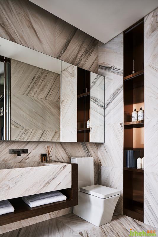 衛(wèi)生間延續(xù)客廳背景墻風格,對紋大理石一體而上,右側(cè)面利用建筑原始墻體打造金屬展示架,兼具功能與美感。木質(zhì)呈懸浮U型包裹臺盆,映射出剛與柔的交融。