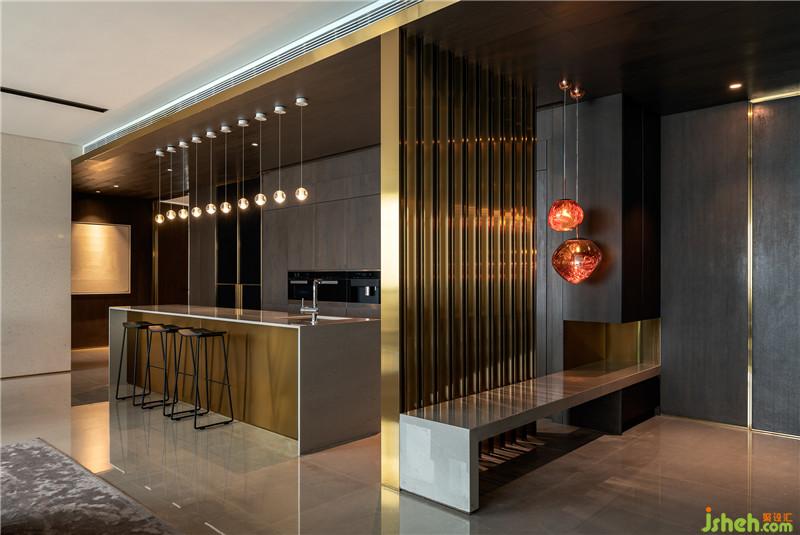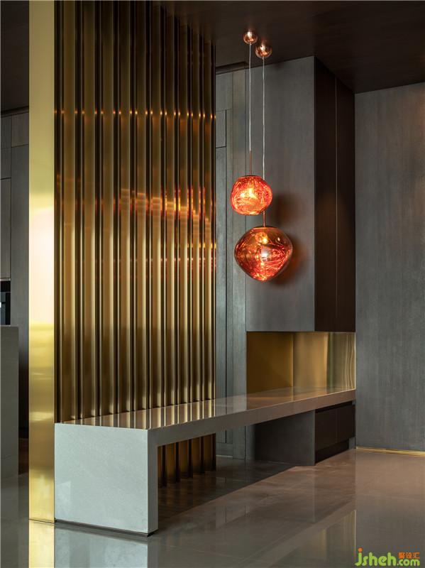 入門即見金屬格柵,巧妙配以燈光做點(diǎn)綴,更有懸浮柜體與石材穿插,滿足生活功用與審美,彰顯精致品味。透過格柵形成錯(cuò)動(dòng)相間、虛實(shí)對比的效果,氤氳出朦朧之美。
