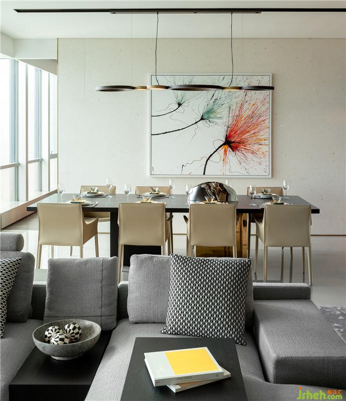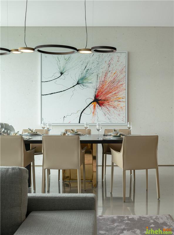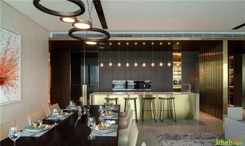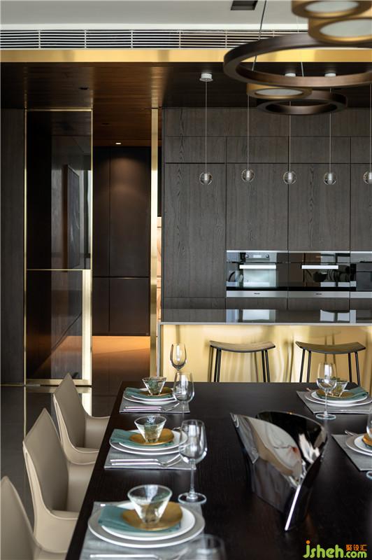廚房與島臺的設(shè)計通過材質(zhì)、色澤、紋理、比例、造型的巧妙搭配,彰顯雋永優(yōu)雅的風(fēng)格。這里與客餐廳開敞互聯(lián),不僅擴大了空間尺度,更搭建了絕佳的情感溝通與自在生活的場景。室內(nèi)設(shè)計師