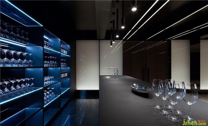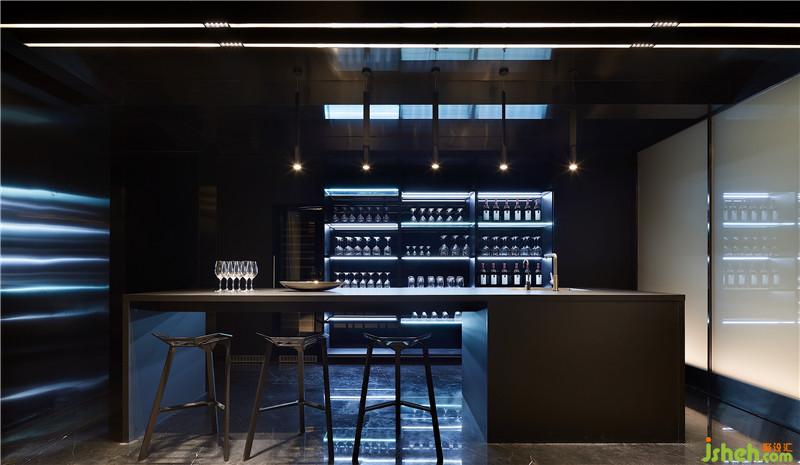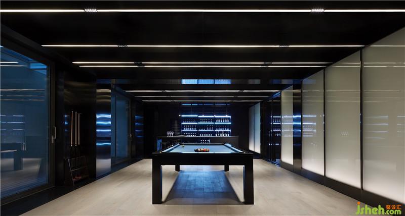 地下一層為休閑娛樂空間,品酒區(qū)、臺球室、影音室、乒乓球室一應(yīng)俱全,滿足業(yè)主多元化的功能需求。臺球室與品酒區(qū)一體而成,經(jīng)由俊朗的材質(zhì)強(qiáng)調(diào)線條垂直感以及映射延展性,塑造出豐富的立體構(gòu)成。