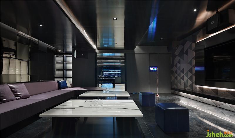 KTV室、影音室宛如魔幻黑盒子,頂面延用映射且又對燈光、層次予以重構(gòu),立面則選用三種深淺有別、自由拼接的幾何形壁布硬包,動感炫酷格調(diào)頓出。