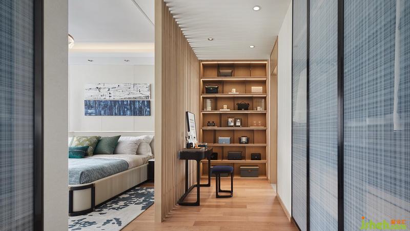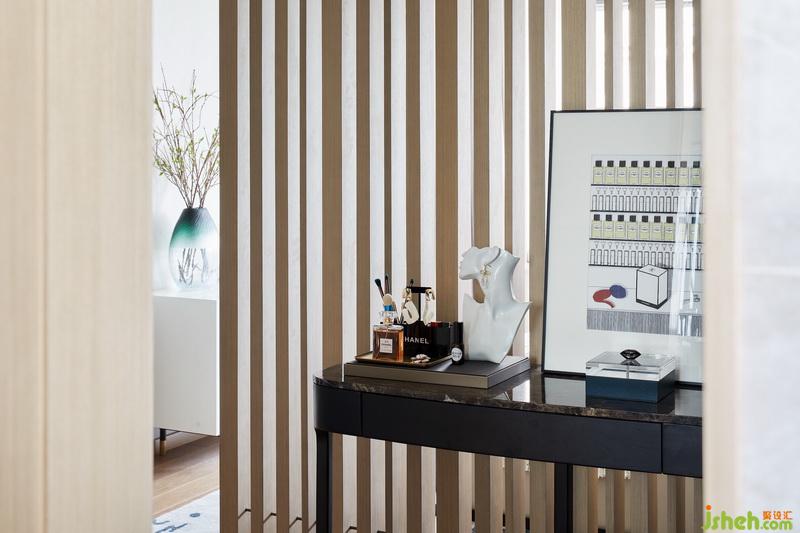 透過木格柵,主臥亦可一窺衣帽間的風采。展示性與功能性兼并的衣帽間設立于走廊盡頭,室內(nèi)設計師在不經(jīng)意的筆觸中,將低調(diào)奢華的高貴感勾勒而出。