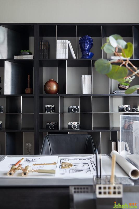書房則以沉穩(wěn)為主基調(diào),不規(guī)則書架設立多樣陳列方式,格架大小不一,擋板傾斜角度各異,兼具功能、特色與美觀,同時便于物件和藏品的展示和存儲。