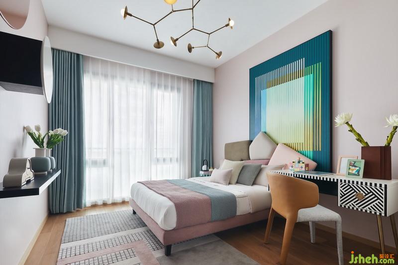 女孩房追求粉嫩、歡快、活潑的氛圍,大尺寸裝飾畫將床、書桌連為一體,強化高低錯落之感,化散為整,裝飾畫與書桌條紋又各相呼應。不規(guī)則枝丫型吊燈裝點天花,瞬間多了一絲俏皮與靈氣。