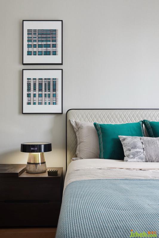 長輩房以淺灰色壁布鋪陳,墻面借用非常規(guī)的側(cè)面裝飾畫營造現(xiàn)代氛圍,以柔和亮色作映襯,渲染一種親和淳樸、安享自身的人生態(tài)度。