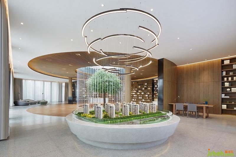 沙盤區(qū)再一次延續(xù)“圓”狀,吊燈縈繞而上,在環(huán)環(huán)遞進(jìn)中勾勒出云形,進(jìn)一步充盈自然氣息,也映襯出弧線的立體感與力量感。
