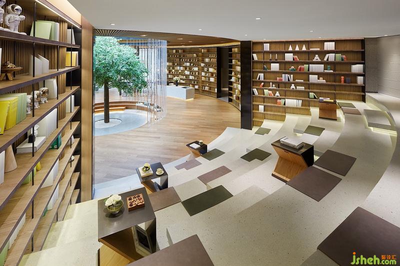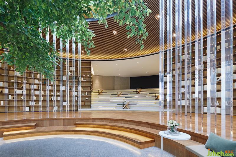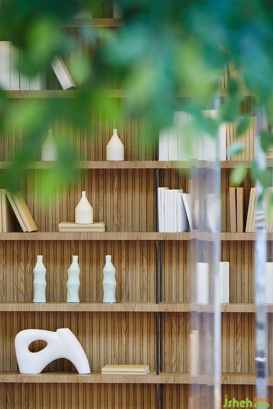 大面積的弧面書架與也與樹屋、水吧構(gòu)成層層包裹,且書架背板沿用木格柵,層板內(nèi)部暗藏?zé)魩?,縱橫之間飽含秩序與細(xì)節(jié)特色。不同主題的書籍分門別類陳列于書架之上,無論成人亦或孩童,總能挑選到自己的心中所愛。