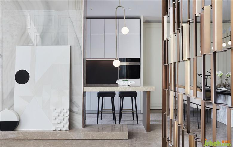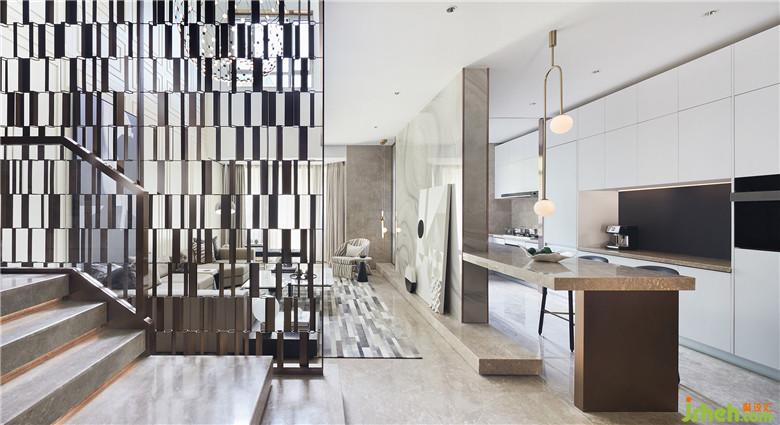 挑高6.5米的客廳,沙發(fā)后方背景線板一貫而上,透過對面的夾絲玻璃與廚房以及二樓客臥套間相望,另一側(cè)借助半遮擋半通透的金屬屏風(fēng)與樓梯對話。此外,客廳亦與吧臺、餐廳開敞聯(lián)合,有效拓展了公共區(qū)域的活動范圍與分區(qū)層次。