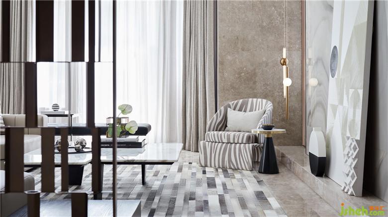 設計元素的呼應與融合在此運用嫻熟:客廳兩端立面的畫作,均由黑白灰三色演繹,以簡約的筆觸勾勒藝術感知;背景線板與沙發(fā)都極具體塊與線條韻律,后方非常規(guī)尺寸的畫作將人的視線自然引向上方,銜接之余又散發(fā)出一種不可言說的魅力;條塊狀金屬屏風衍生的錯位分割感,也在兩幅畫作、茶幾、牛皮拼接地毯上得到體現。