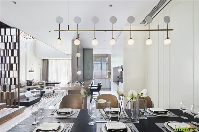 不同的材質、造型、色澤于餐廳交織,錯落有致,立面沿用大塊面線板充當最適宜的調色板,渲染出典雅且輕松的用餐環(huán)境。