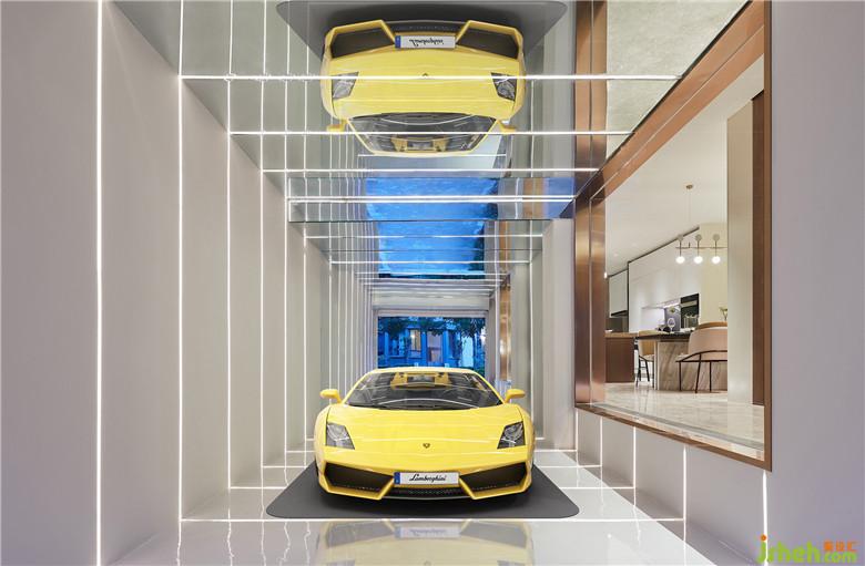 車庫借由立面與頂面的鏡面反射,與LED燈帶一起,構筑虛實層疊與縱深擴容的效果,科技感十足。透過右側玻璃與餐廳、過道互動,車庫化身精美展廳,并成為室內頗具玩味的一景。