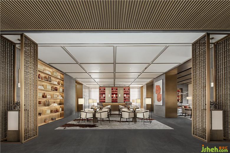 淺度洽談區(qū),左右對稱,尊崇禮制,門洞與展示格架大小相同且彼此對應(yīng),頂部同樣為印章輪廓組合而成,讓水吧臺背景退到最末端,譜寫一場深與淺、光與暗、近和遠(yuǎn)的和諧奏鳴曲。在陳設(shè)上則精心擷取了具有通透質(zhì)感的琉璃,古典的造型,質(zhì)樸的色澤,都恰到好處。