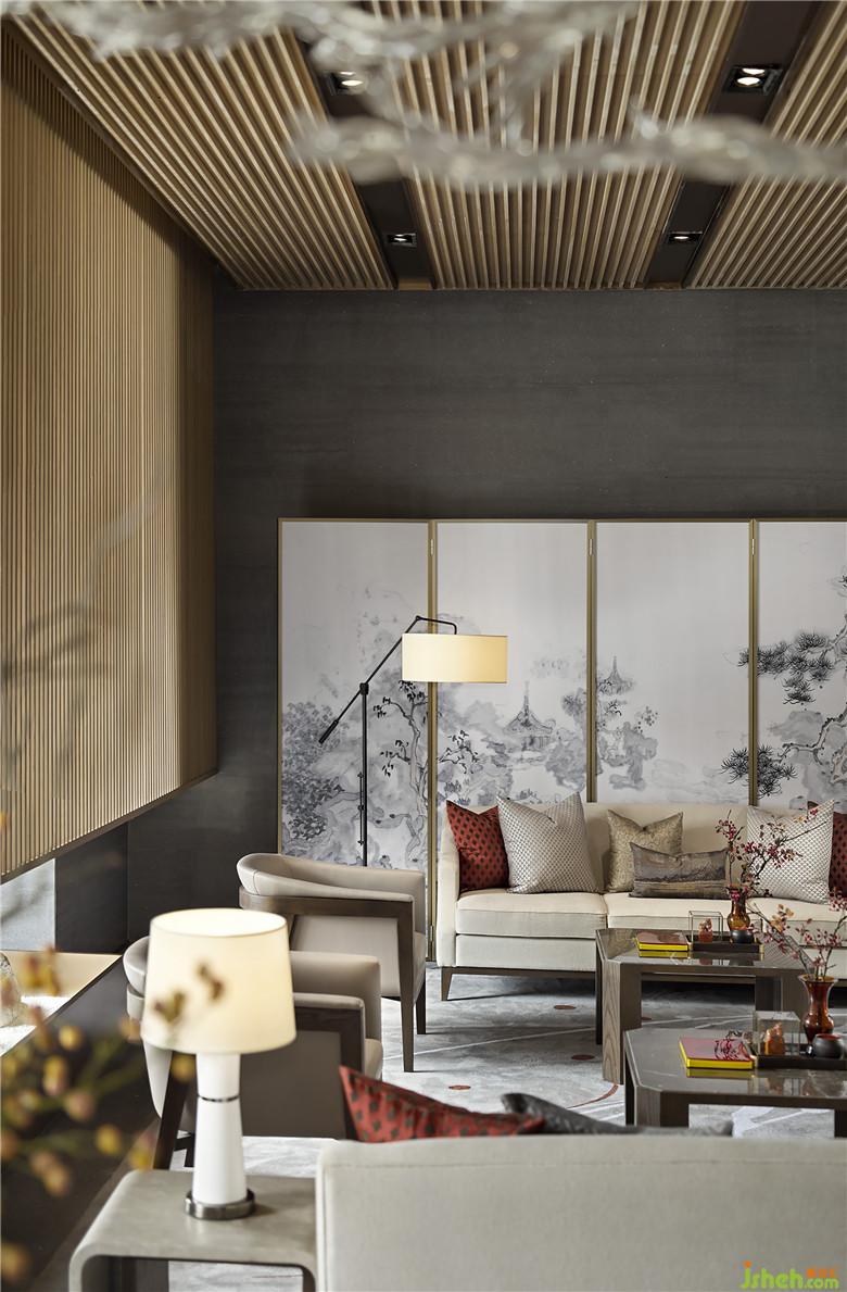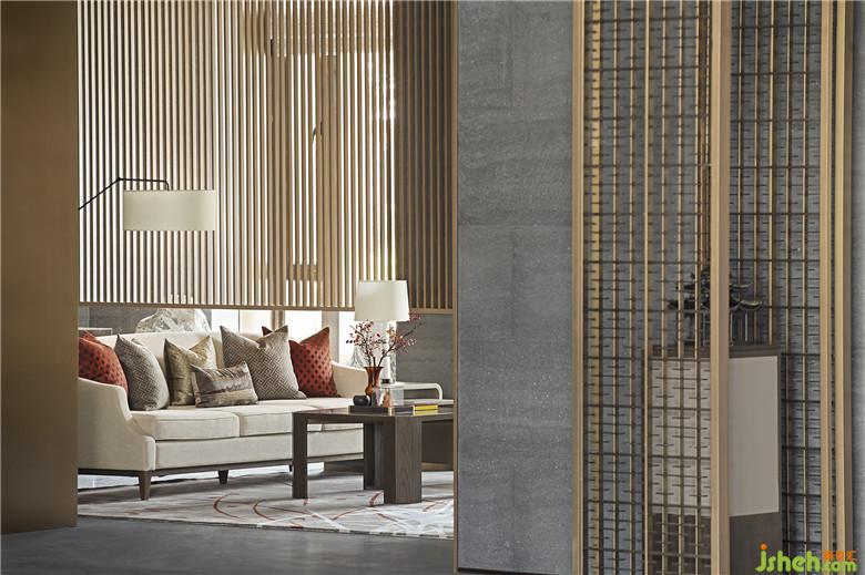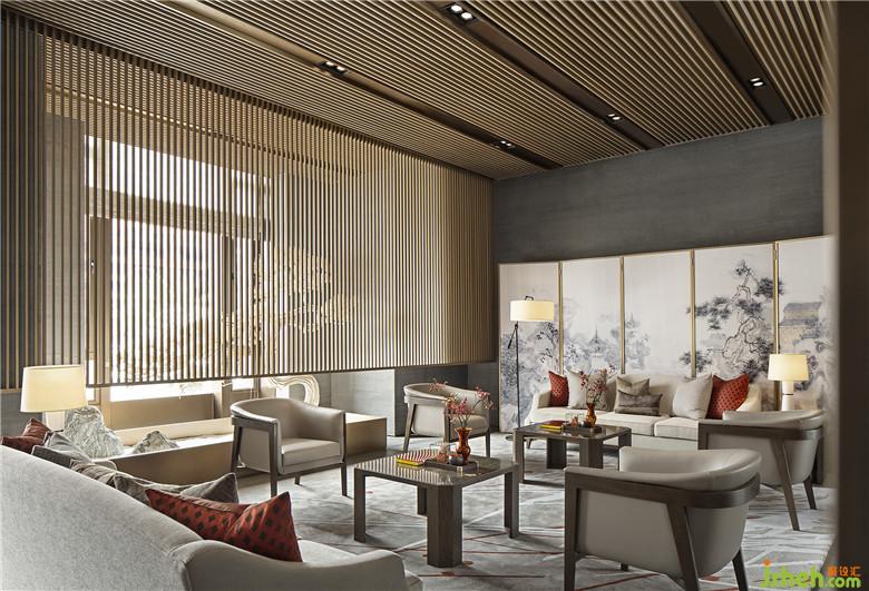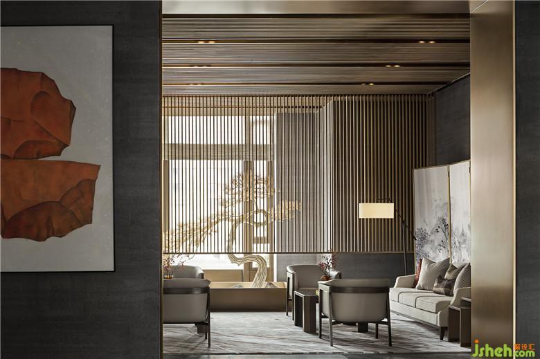 緊鄰淺度洽談區(qū)的一側(cè),設(shè)立深度洽談區(qū)與品茗區(qū),在半開敞半私密的復(fù)合型布局中,木格柵材質(zhì)以橫豎并存的姿態(tài)出現(xiàn),更具韻律節(jié)奏。此外還引入園林造景技法,虛透中亦可一窺山石松林,領(lǐng)略到“窗前有風(fēng)景、心中有山水、茶中有天地”。