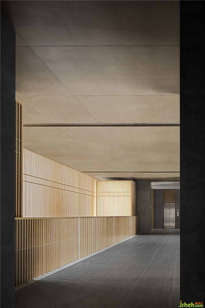 考慮到實用性與安全性,空中連廊處以玻璃扶手作為有力支撐,外圍予以木格柵裝飾,整體用色克制統(tǒng)一,在極具秩序感的光影里,彰顯了設計師一貫簡約純粹的風格。