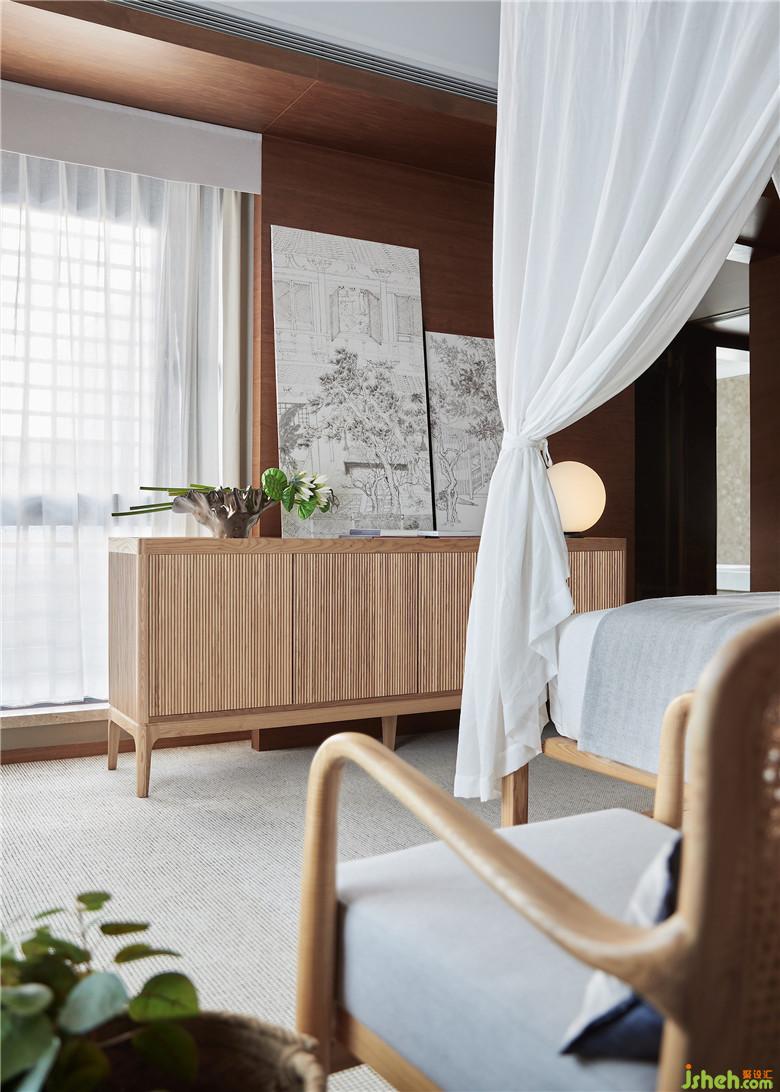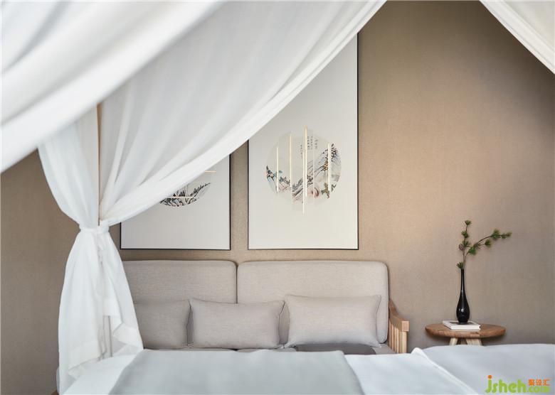 二樓主臥充分利用采光,參照酒店式起居場景,“人”字型屋頂配上架子床,空間感更強,也進一步映射出東方氣息以及度假風情。