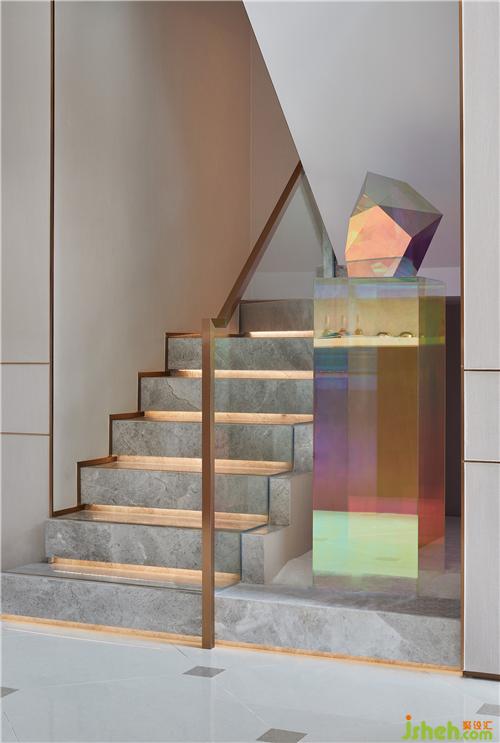 移步向下,B1層樓梯口設(shè)立水晶鉆石造型的陳列品,彰顯其非凡的地位。