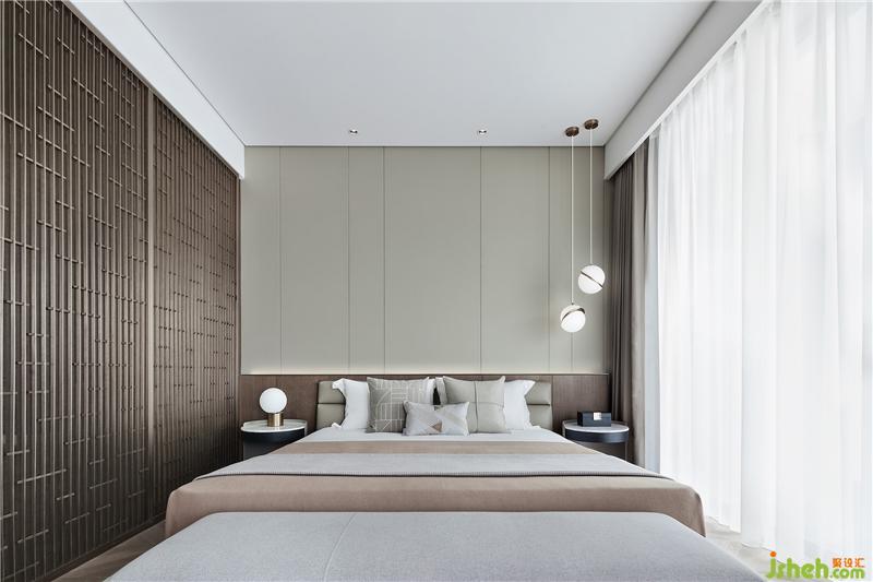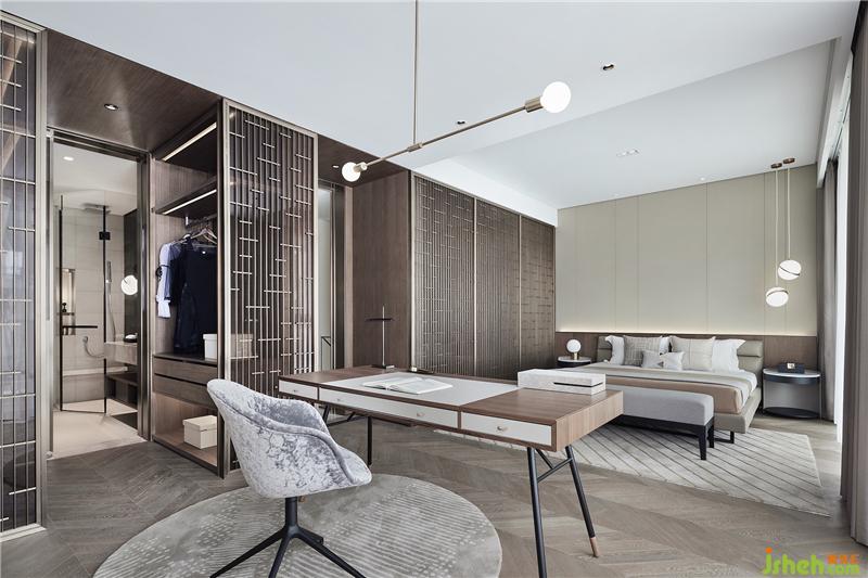 主臥套間以遞進(jìn)式的布局、豐富的質(zhì)感打造出層層疊疊的精致韻味,夾絲玻璃與木飾面、金屬格柵的多重組合,既有上下一體的延續(xù)性,又賦予其滿(mǎn)滿(mǎn)的設(shè)計(jì)感與溫馨感。格柵的紋理布局極具考究,可謂窗欞元素的活化運(yùn)用與園林藝術(shù)的當(dāng)代表達(dá)。