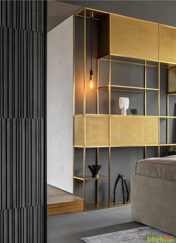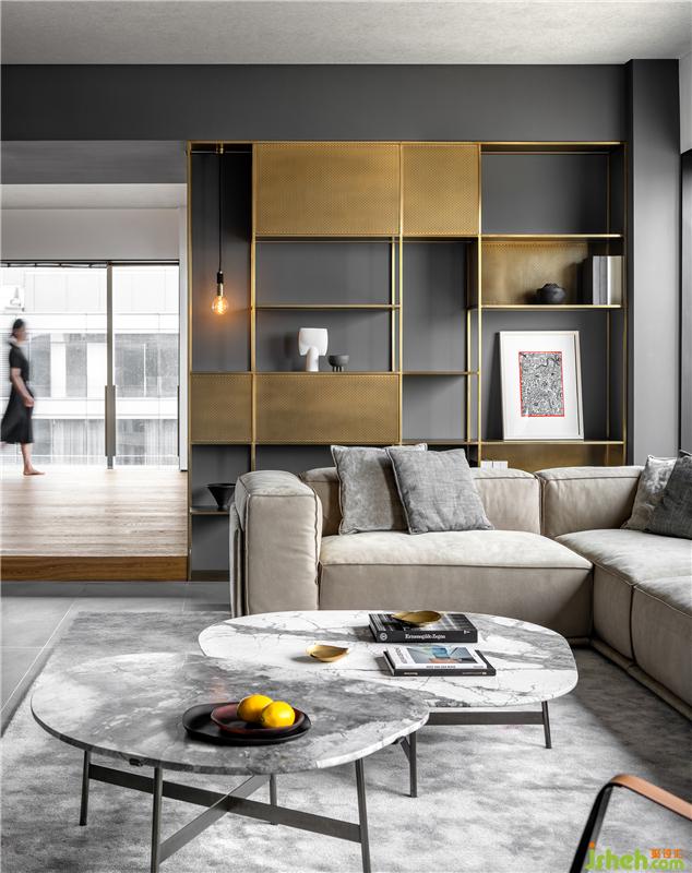 客廳受結(jié)構(gòu)的限制及業(yè)主的要求,進(jìn)行了適度的比例縮放。大面落地窗加強(qiáng)室內(nèi)外的聯(lián)動,南浦大橋美景盡收眼底。軟裝陳設(shè)在素凈的基調(diào)下盡顯隨性自由氣息,力求還原生活本真。L型沙發(fā)極盡柔軟,而定制的黃銅格架,借由沖孔板的穿梭點(diǎn)綴,在不拘一格的形態(tài)關(guān)系中有效拉升層次,可謂恰到好處的調(diào)和。