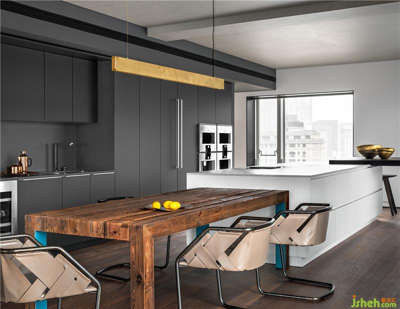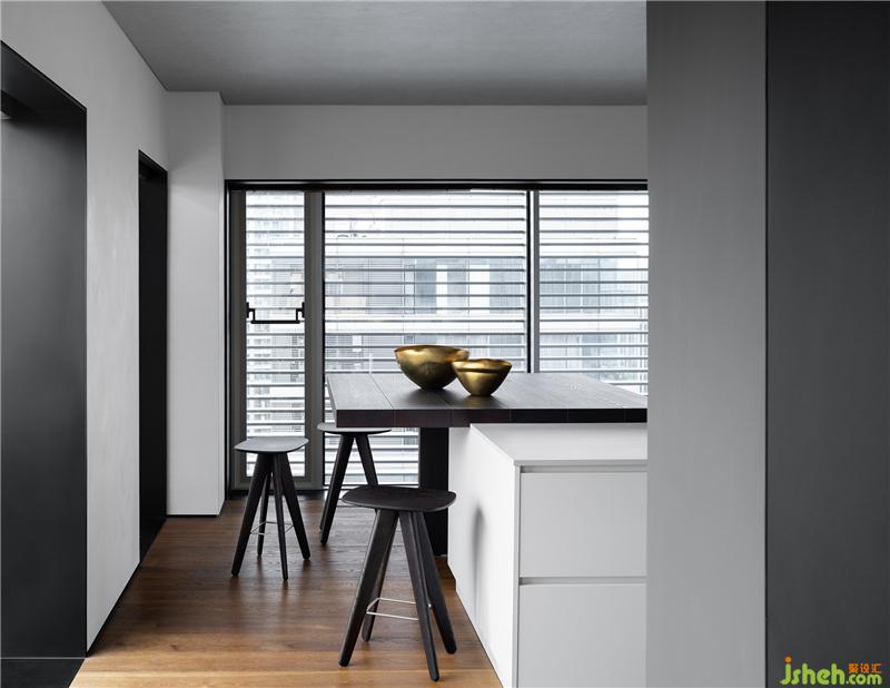 餐桌與島臺一體順延,呈疊級狀起伏,與西廚區(qū)的開放互聯(lián)也遵循著豪宅應(yīng)有的比例尺度。三面落地窗讓這里擁攬絕佳的視野與采光,透過形態(tài)、材料、色澤與細(xì)節(jié),越發(fā)詮釋出大都會的俊朗風(fēng)度。這是裝修設(shè)計團(tuán)隊對一貫的克制平衡之道的踐行,蘊(yùn)藏著對簡約美學(xué)的嚴(yán)謹(jǐn)思考,也無一不透露出對品質(zhì)感的嚴(yán)苛追求。