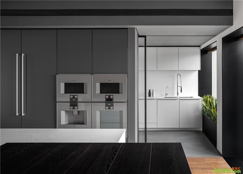 中廚同樣延續(xù)與島臺區(qū)的貫通,基于使用場景與習慣,設置暗藏式玻璃移門,來實現(xiàn)開合之道的隨心轉(zhuǎn)變,這也是設計師對功效和意義上的雙重平衡,對家庭成員情感互動的又一細節(jié)處理。其中蘊含的層次變化盡顯干凈利落,又不乏其獨特的張力。